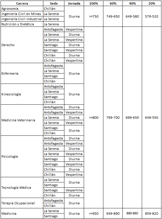 Dirigida a personas que hayan obtenido un puntaje de acuerdo a la tabla adjunta, con respecto al promedio de las pruebas de Compresión Lectora y Competencia Matemática 1 en las 4 últimas PAES (dos de invierno y dos de verano).