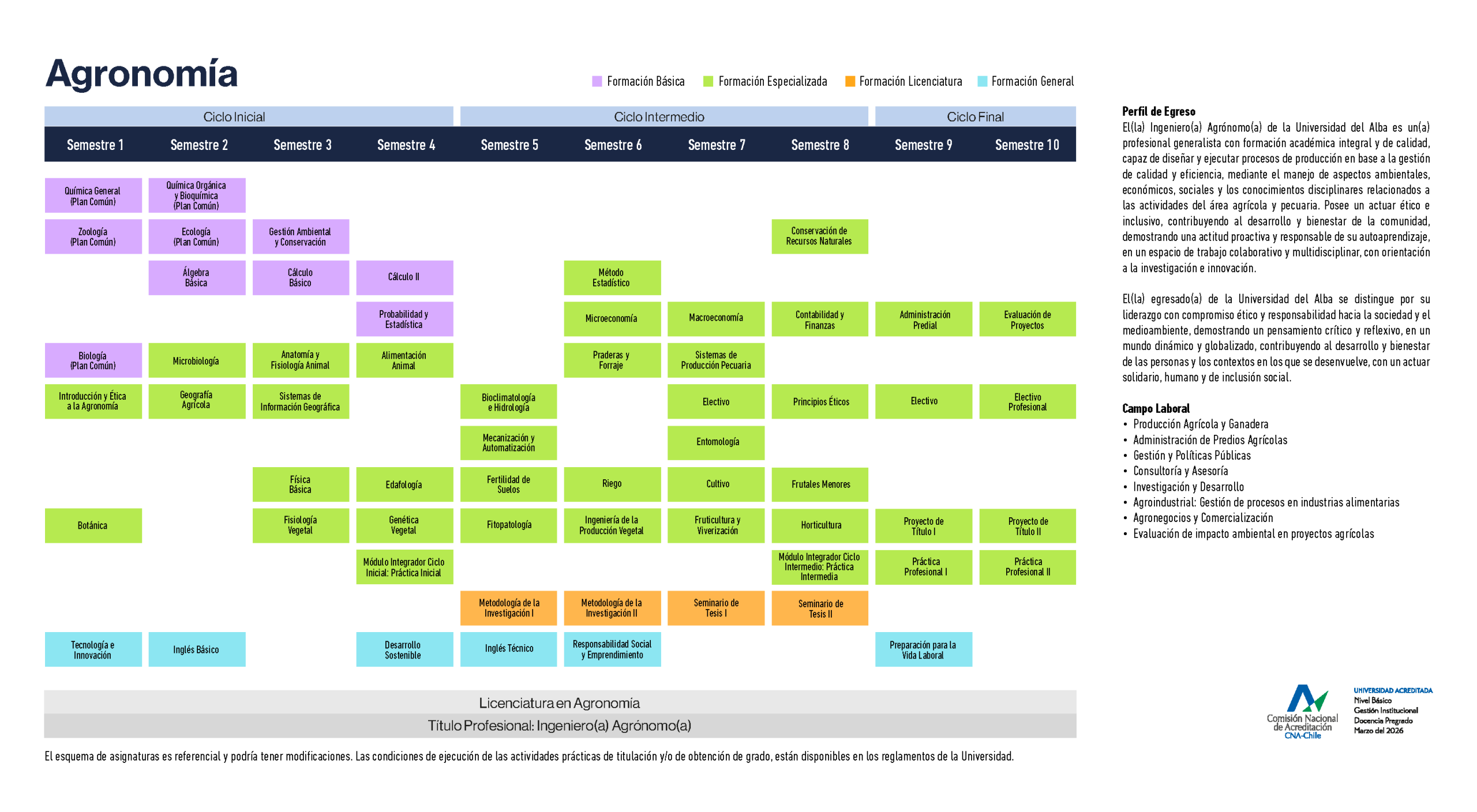 El Ingeniero Agrónomo de la Universidad del Alba es un profesional generalista con formación académica integral y de calidad, capaz de diseñar y ejecutar procesos de producción en base a la gestión de calidad y eficiencia, mediante el manejo de aspectos ambientales, económicos, sociales y los conocimientos disciplinares relacionados a las actividades del área agrícola y pecuaria. Posee un actuar ético e inclusivo, contribuyendo al desarrollo y bienestar de la comunidad, demostrando una actitud proactiva y responsable de su autoaprendizaje, en un espacio de trabajo colaborativo y multidisciplinar, con orientación a la investigación e innovación.