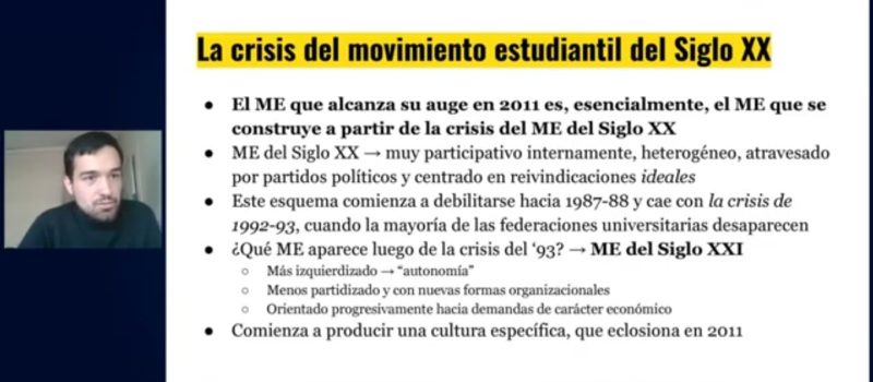 “Es un campo donde compiten y disputan diferentes actores, con diferentes orientaciones normativas y pautas de acción colectiva, donde se disputa la representación o la hegemonía de la representación del movimiento estudiantil como conjunto, pero también puede ser sujeto en el sentido de que puede plantear ciertas demandas”, reflexionó.