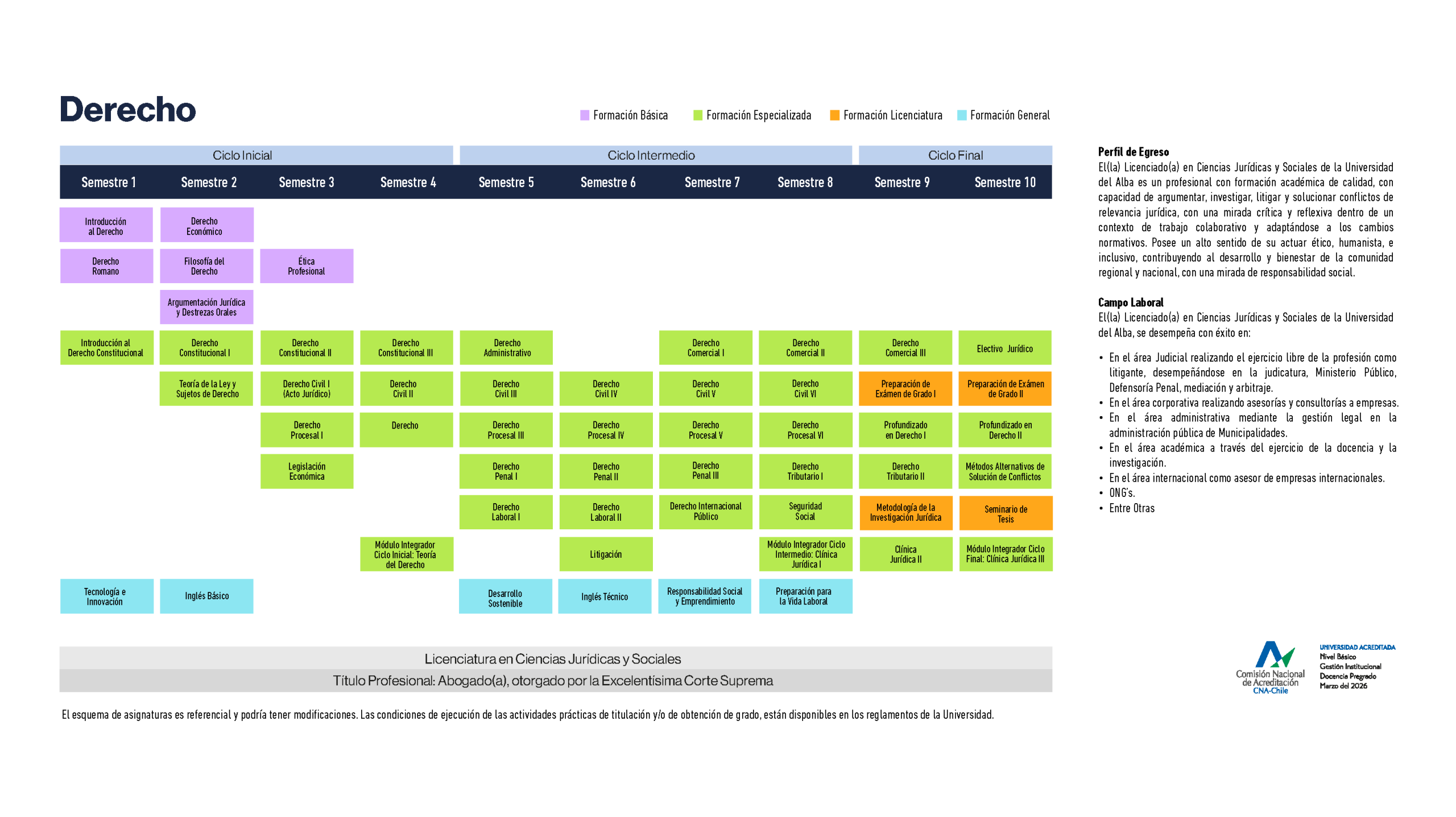 El Licenciado en Ciencias Jurídicas y Sociales de la Universidad del Alba es un profesional con formación académica de calidad, con capacidad de argumentar, investigar, litigar y solucionar conflictos de relevancia jurídica, con una mirada crítica y reflexiva dentro de un contexto de trabajo colaborativo y adaptándose a los cambios normativos. Posee un alto sentido de su actuar ético, humanista, e inclusivo, contribuyendo al desarrollo y bienestar de la comunidad regional y nacional, con una mirada de responsabilidad social.
