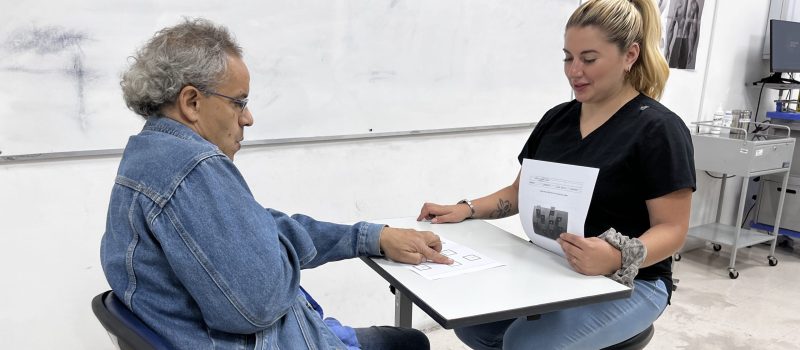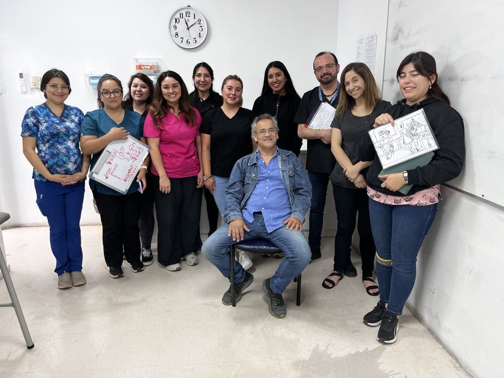 Durante la jornada, las profesionales simularon una atención clínica junto a un actor profesional, quien interpretó a un paciente adulto mayor con diversas necesidades, permitiendo así fortalecer habilidades evaluativas y de intervención en un entorno controlado.