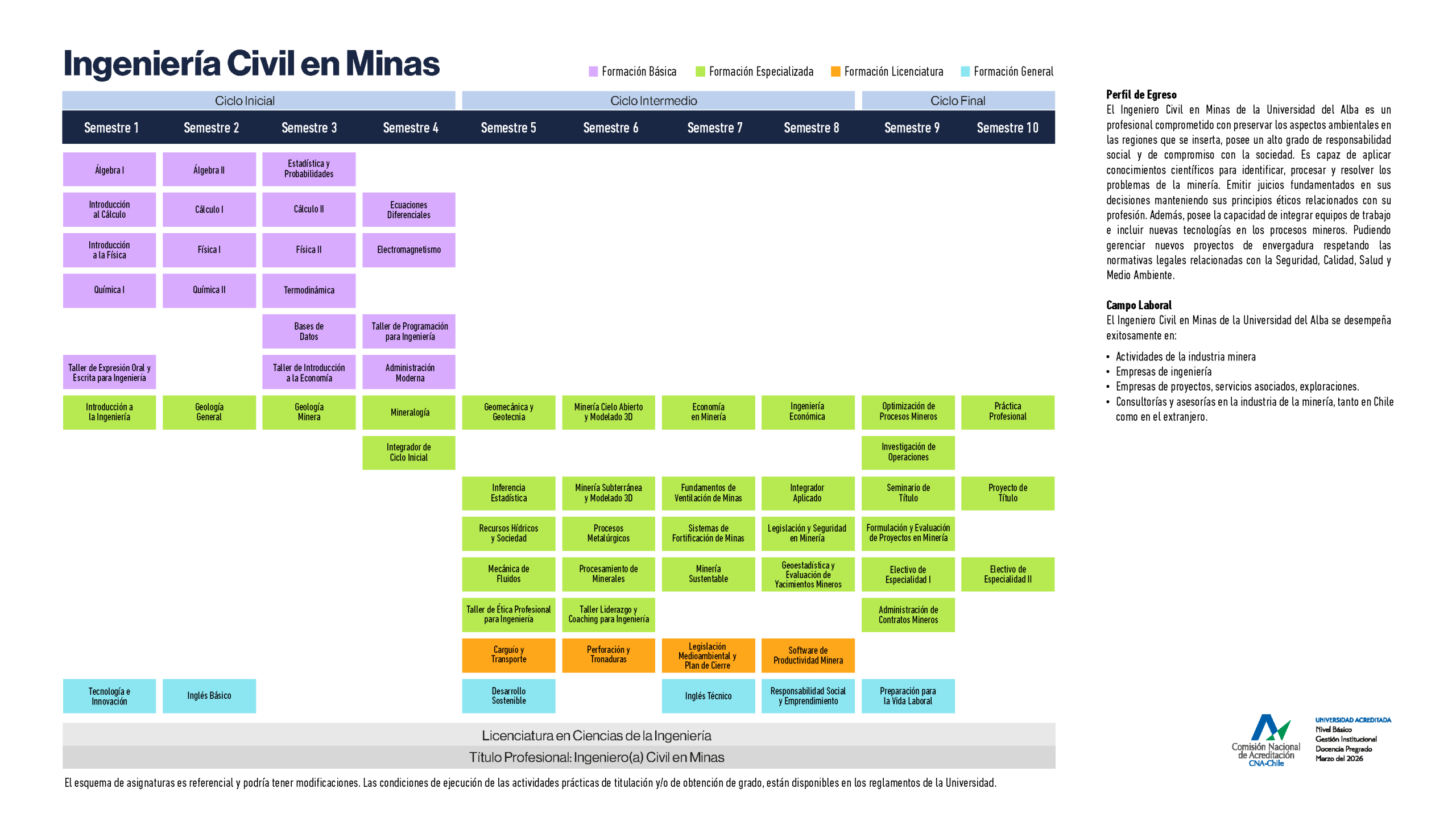 El Ingeniero Civil en Minas de la Universidad del Alba es un profesional comprometido con preservar los aspectos ambientales en las regiones que se inserta, posee un alto grado de responsabilidad social y de compromiso con la sociedad. Es capaz de aplicar conocimientos científicos para identificar, procesar y resolver los problemas de la minería. Emitir juicios fundamentados en sus decisiones manteniendo sus principios éticos relacionados con su profesión. Además, posee la capacidad de integrar equipos de trabajo e incluir nuevas tecnologías en los procesos mineros. Pudiendo gerenciar nuevos proyectos de envergadura respetando las normativas legales relacionadas con la Seguridad, Calidad, Salud y Medio Ambiente.