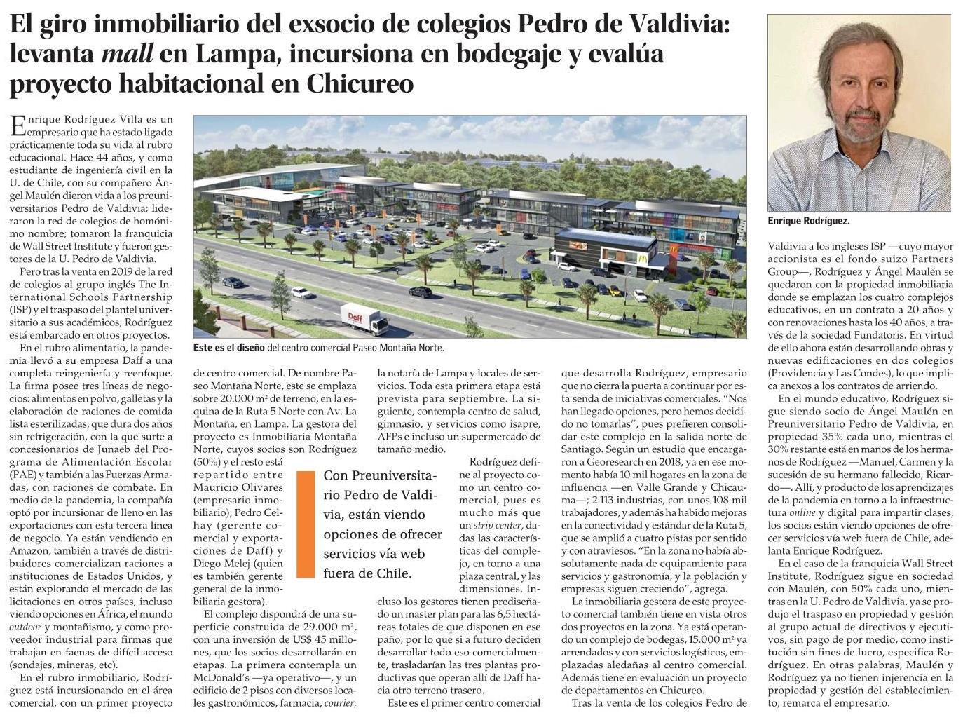 En un artículo periodístico publicado por El Mercurio, se entregan detalles del actual momento empresarial de Enrique Rodríguez Villa, quien fue uno de los socios fundadores de nuestra casa de estudios. Hoy está dedicado a una serie de proyectos inmobiliarios, a través de la empresa Daff, también tiene participación en la industria de alimentos y, a nivel educacional, sigue siendo uno de los dueños de los preuniversitarios Pedro de Valdivia.