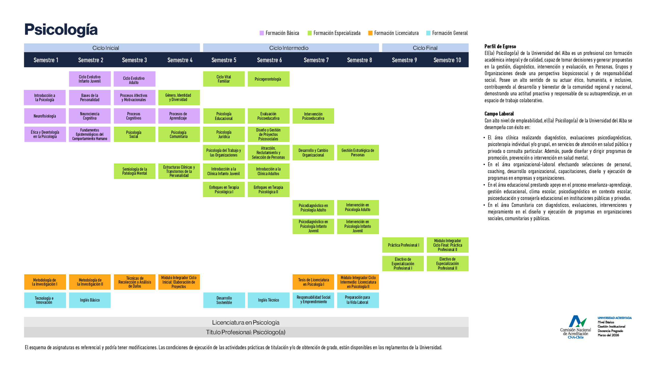 El Psicólogo de la Universidad del Alba es un profesional con formación académica integral y de calidad, capaz de tomar decisiones y generar propuestas en la gestión, diagnóstico, intervención y evaluación, en Personas, Grupos y Organizaciones desde una perspectiva biopsicosocial y de responsabilidad social. Posee un alto sentido de su actuar ético, humanista, e inclusivo, contribuyendo al desarrollo y bienestar de la comunidad regional y nacional, demostrando una actitud proactiva y responsable de su autoaprendizaje, en un espacio de trabajo colaborativo.