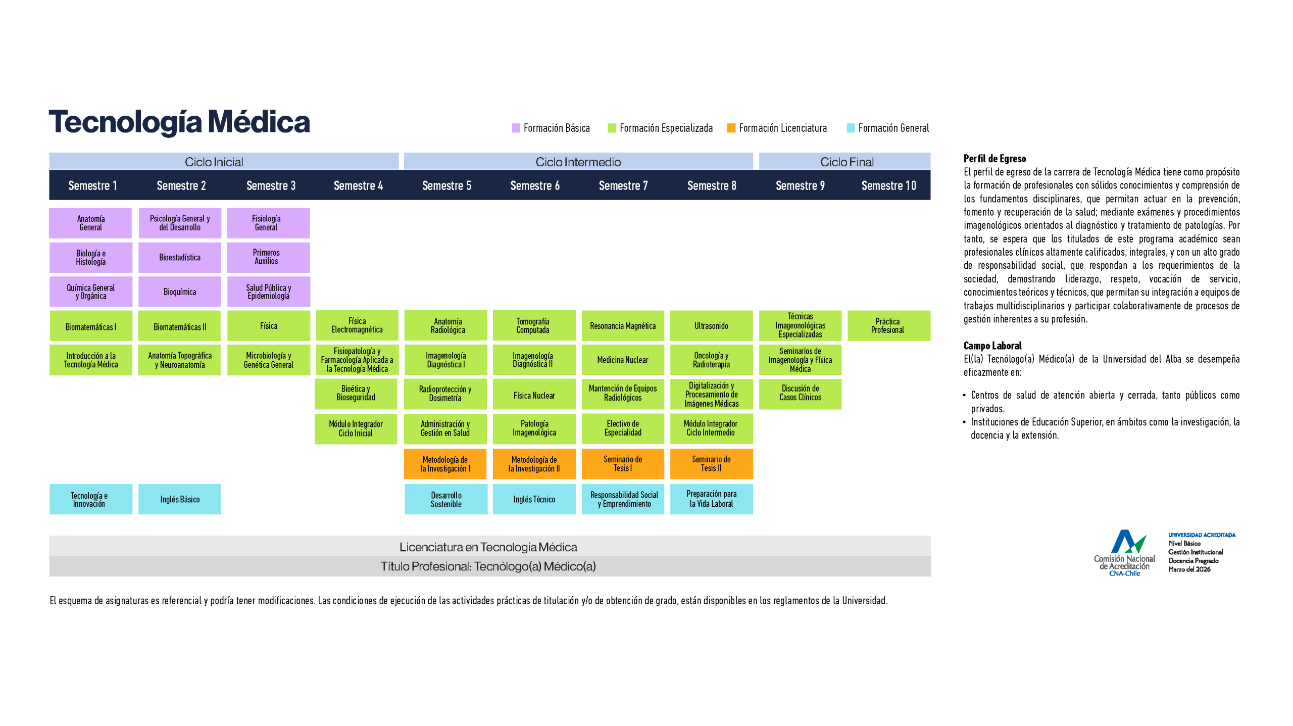 El perfil de egreso de la carrera de Tecnología Médica tiene como propósito la formación de profesionales con sólidos conocimientos y comprensión de los fundamentos disciplinares, que permitan actuar en la prevención, fomento y recuperación de la salud; mediante exámenes y procedimientos imagenológicos orientados al diagnóstico y tratamiento de patologías. Por tanto, se espera que los titulados de este programa académico sean profesionales clínicos altamente calificados, integrales, y con un alto grado de responsabilidad social, que respondan a los requerimientos de la sociedad, demostrando liderazgo, respeto, vocación de servicio, conocimientos teóricos y técnicos, que permitan su integración a equipos de trabajos multidisciplinarios y participar colaborativamente de procesos de gestión inherentes a su profesión.
