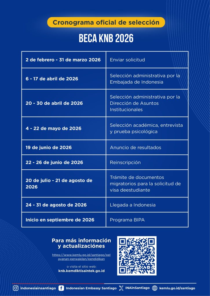 El proceso de postulación es hasta el 31 de marzo, mientras que los resultados serán información por la Embajada de Indonesia el 19 de junio. El inicio del programa está agendado para septiembre de 2026.
