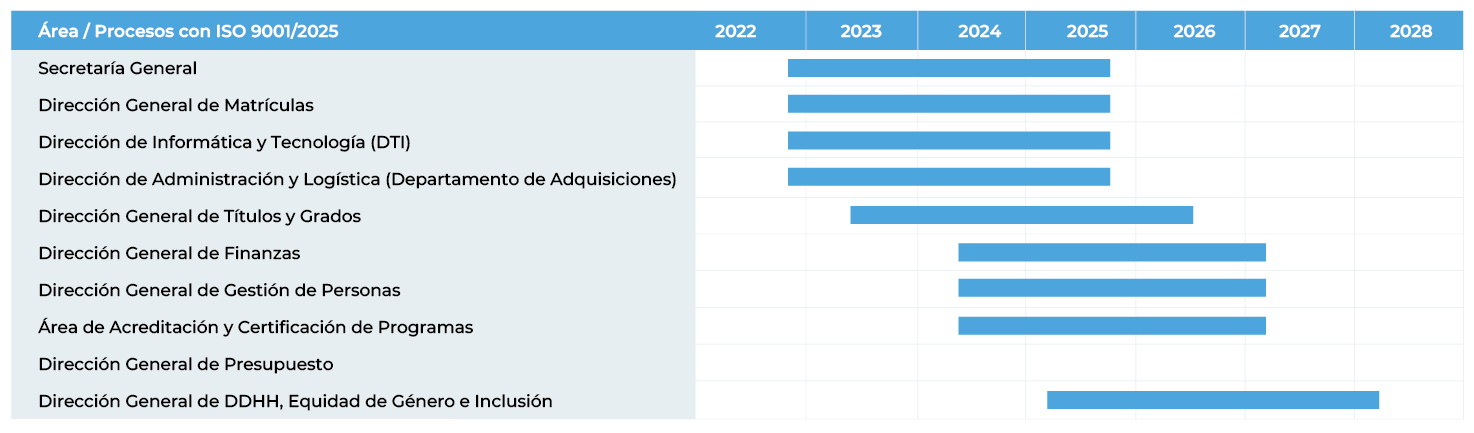 La Universidad del Alba cuenta actualmente con nueve áreas certificadas bajo la norma ISO 9001:2015, lo que evidencia el cumplimiento de los estándares del ciclo de calidad.